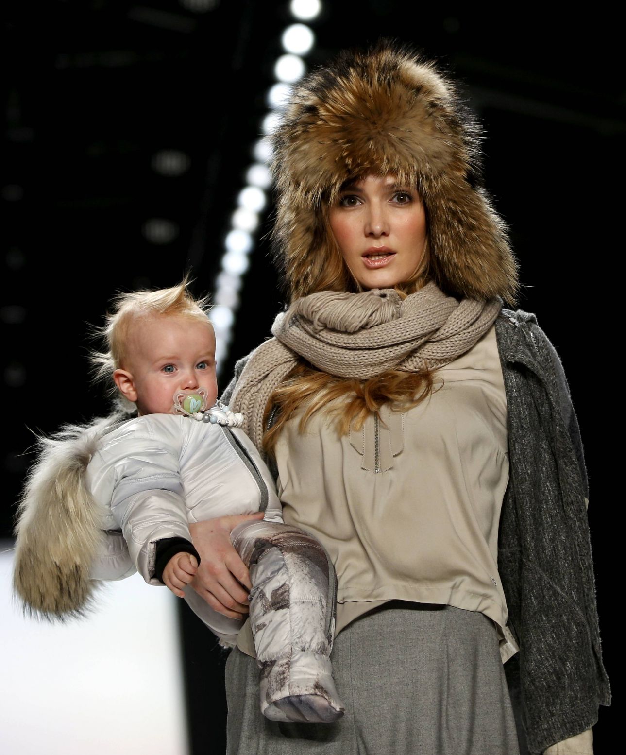 Μοντέλο παρουσιάζει τα ρούχα της εταιρείας Sportalm κρατώντας ένα μωρό στο χερί. Γούνινα καπέλα και γυαλιά του σκι ήταν τα βασικά κομμάτια της συλλογής, συνδυασμένα όμως με πιο αέρινα φορέματα και ανάλαφρα υλικά για εξορμήσεις στην πόλη και όχι στο βουνό