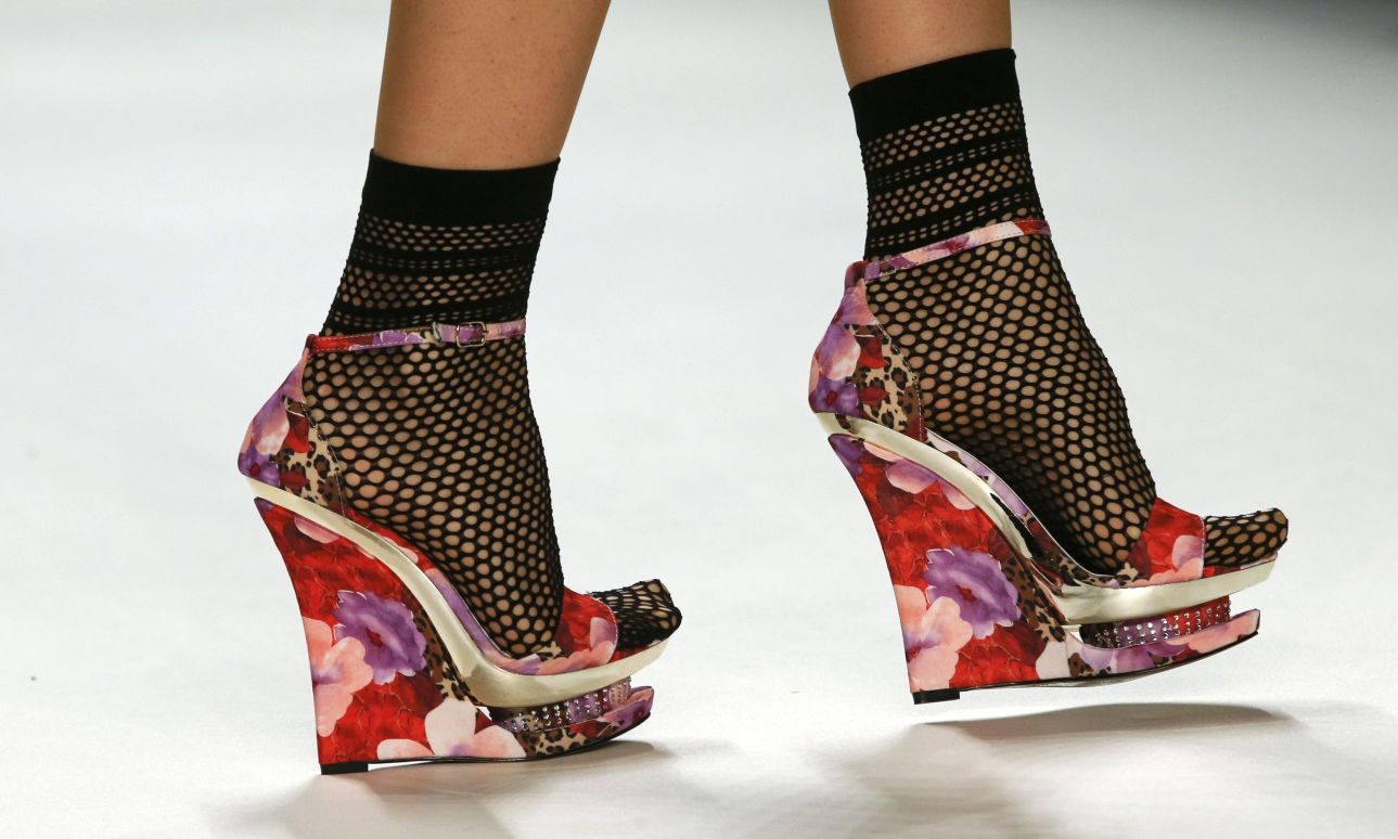 Σανδάλια με φλοράλ σχέδια σε χειμωνιάτικους τόνους φορεμένα με διχτυωτά καλτσάκια. Η γερμανίδα σχεδιάστρια Anja Gockel, φέτος παρουσιάζει την 20η της συλλογή, έχει σπουδάσει εικαστικά και το σήμα κατατεθέν της είναι τα έντονα, ασυνήθιστα φλοράλ μοτίβα