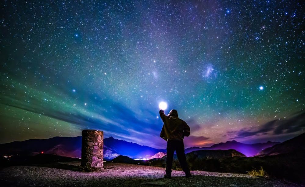 Ενα ουρανός γεμάτος αστέρια, παραμυθένια χρώματα και ένας άνδρας που φαίνεται σαν να κρατάει το φεγγάρι στο χέρι του