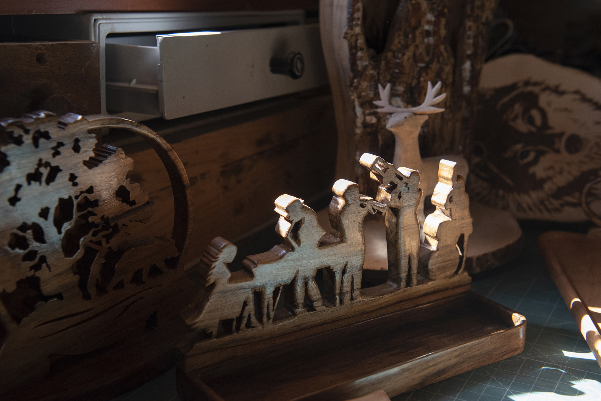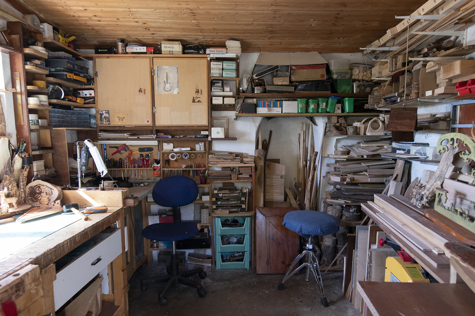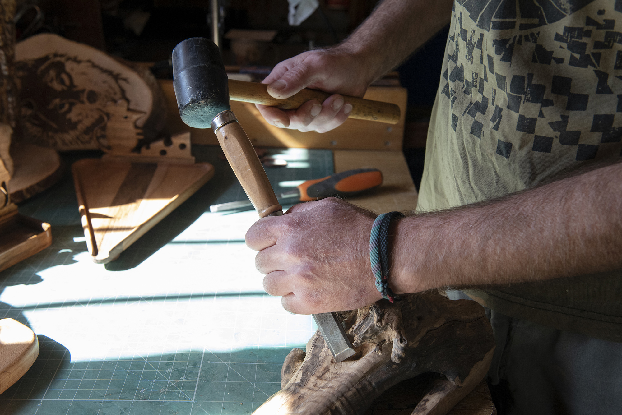 Ο πάγκος του εργαστηρίου, αλλά και ο χώρος γενικότερα, είναι γεμάτος με διάφορα σύνεργα που βοηθούν το Γιάννη, να δίνει κάθε φορά το σχήμα που θέλει στο ξύλο. Ξεκίνησε ως μουσικός καθώς έπαιζε για πολλά χρόνια κιθάρα και σπούδασε και ηχοληψία. «Το 2013, το χειμώνα, αποφασίσαμε με την Ιουλία, να έρθουμε να μείνουμε εδώ στο χωριό. Το πατρικό σπίτι της, το σπίτι της γιαγιάς της, χρειαζόταν κάποιες επιδιορθώσεις τις οποίες και κάναμε. Μας αρέσει η ζωή στο Τσεπέλοβο. Έχει αυτό που αναζητούσαμε, ηρεμία και ταυτόχρονα χρόνο για τον εαυτό σου και τη ισορροπία σου», μας λέει ο Γιάννης και συνεχίζει: «Πριν έρθουμε εδώ, είχα ασχοληθεί επίσης με την κατασκευή ξύλινων μουσικών οργάνων. Αξιοποίησα τη γνώση αυτή και ξεκίνησα να φτιάχνω διάφορα τόσο χρηστικά όσο και διακοσμητικά ξυλόγλυπτα.»
