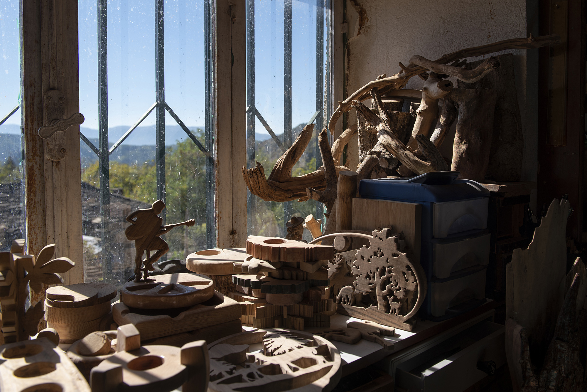 Ένα παλιό όμορφο πέτρινο σπίτι με κόκκινα παράθυρα, και στο πλάι της αυλής, μία πόρτα σε οδηγεί στο εργαστήρι. «Είναι το εργαστήρι ίσως με την καλύτερη θέα», θα μας πει η σύντροφος του Γιάννη, η Ιουλία, καθώς μπροστά από τον πάγκο εργασίας απλώνεται πανοραμικά όλο το χωριό, με τις πέτρινες στέγες, αλλά και την οργιώδη φύση του Ζαγορίου.