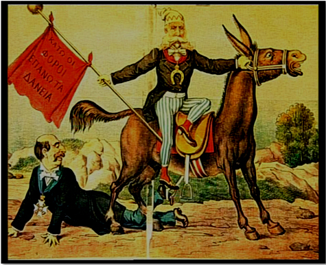 πιστωτώνΣαρκαστική γελοιογραφία από τον «ΝΕΟ ΑΡΙΣΤΟΦΑΝΗ». Ο Χαρίλαος Τρικούπης, που εμφανίζεται ως καραγκιόζης επί χοίρου, δεν βρισκόταν στη ζωή όταν η Ελλάδα πλήρωνε το τίμημα της χρεοκοπίας του. Το γουρούνι συμβόλιζε τον χειμαζόμενο λαό Στο σημείωμα που είναι εν γνώσει των τριών πολιτικών αρχηγών της τρικομματικής κυβέρνησης με τίτλο «Ενισχυμένη Διακυβέρνηση και Μηχανισμοί Ελέγχου» γίνεται λόγος για ειδικό λογαριασμό ο οποίος θα βρίσκεται υπό διεθνή διαχείριση, ενώ σημειώνεται ότι οι αποκλίσεις από τους στόχους του προγράμματος θα πρέπει να εξισορροπούνται μέσω εσωτερικών προσαρμογών. Επί της ουσίας έχουμε μια επιστροφή, εάν επιμείνουν στο μέλλον οι Γερμανοί, διότι για την παρούσα χρονική στιγμή δεν συζητείται, στο καθεστώς του διεθνούς οικονομικού ελέγχου στην Ελλάδα, μετά από την ήττα στον άτυχο ελληνοτουρκικό πόλεμο και της οικονομικής κρίσης του 1893, έτος κατά το οποίο ο Χαρίλαος Τρικούπης κατά την τελευταία πρωθυπουργία του κήρυξε πτώχευση. Η γερμανική πλευρά επανέφερε το θέμα της δημιουργίας δεύτερου ειδικού λογαριασμού (θα τελεί υπό τη διαχείριση της Ευρωπαϊκής Κεντρικής Τράπεζας), πέραν του υπάρχοντος στην Τράπεζα της Ελλάδος, μέσω του οποίου θα γίνεται η διαχείριση των πόρων του ελληνικού κράτους από τους ξένους. Το γερμανικό σχέδιο μας γυρίζει στο 1898, όταν η πρώτη τρόικα πάτησε το πόδι της στην Ελλάδα και αποτελείτο από τους Τέστα (Γερμανός), Λετάν (Γάλλος) και Λόου (Αγγλος) που ήταν επικεφαλής της Διεθνούς Οικονομικής Επιτροπής (Commission Internationale Financiere de la Grece) δηλαδή του Διεθνή Οικονομικού Ελέγχου που επιβλήθηκε στη χώρα μας. Ο Διεθνής Οικονομικός Έλεγχος (ΔΟΕ) ονομαζόταν ο έλεγχος των δημοσίων οικονομικών της Ελλάδας που επιβλήθηκε από Ευρωπαϊκές χώρες που δάνεισαν τη χώρα μας το φθινόπωρο του 1897 ενώ αυτή είχε χρεοκοπήσει τέσσερα χρόνια πριν, με στόχο την αποπληρωμή των χρεών της προς τους πιστωτές της. Ήταν μια εξαμελής επιτροπή, η Διεθνής Οικονομική Επιτροπή, με μόνιμη εγκατάσταση στην Ελλάδα από το 1897 μέχρι το 1978, για 81 χρόνια. Η συμφωνία με τους πιστωτές προέβλεπε: 1. Χορήγηση δανείου πολεμικών επανορθώσεων και του «οικονομικού δανείου». Εκχωρήθηκε εγγυημένο δάνειο 151,3 εκατ. φράγκων, από τις Μεγάλες Δυνάμεις στην Ελλάδα. 2. Υποθήκευση φορολογικών εσόδων ώστε να εξασφαλισθεί η αποπληρωμή των δανείων. Στον ΔΟΕ αποδίδονταν τα έσοδα των μονοπωλίων αλατιού, πετρελαίου, σπίρτων, τραπουλόχαρτων, τσιγαροχάρτων και σμύριδας Νάξου, ο φόρος καπνού, τα τέλη χαρτοσήμου και οι δασμοί του τελωνείου Πειραιά. 3. Αναδιάρθρωση του χρέους Ο Διεθνής Οικονομικός Έλεγχος (ΔΟΕ), ο οποίος επιβλήθηκε από τις Μεγάλες Δυνάμεις στη χώρα μας, επιδείνωσε την τραγική κατάσταση της εθνικής οικονομίας, που δημιούργησε η πτώχευση του 1893 και εξελίχθηκε σε οικονομική κρίση. Εθνική ταπείνωση, πολιτική αστάθεια, αδιανόητη φτώχεια, κοινωνική αναστάτωση, ευρύτατο κύμα μετανάστευσης και αδυναμία διαχείρισης της κρίσης από τις υπεύθυνες ηγεσίες, είναι οι βασικές συνιστώσες της πολιτικής κατάστασης της χώρας κατά την υπόψη περίοδο. Οι διεθνείς οικονομικές κυρώσεις, οι οποίες με τη συνθήκη ειρήνης επιδείνωσαν το οικονομικό αδιέξοδο και κατέστησαν προβληματική την επιβίωση της κοινωνίας και της χώρας. Παράλληλα όμως η κατάσταση αυτή αποτέλεσε το έναυσμα της εθνικής αφύπνισης και συστράτευσης, για μια νέα ανοδική και ελπιδοφόρα πορεία του Ελληνισμο